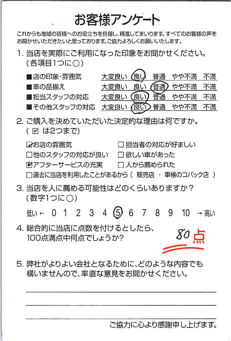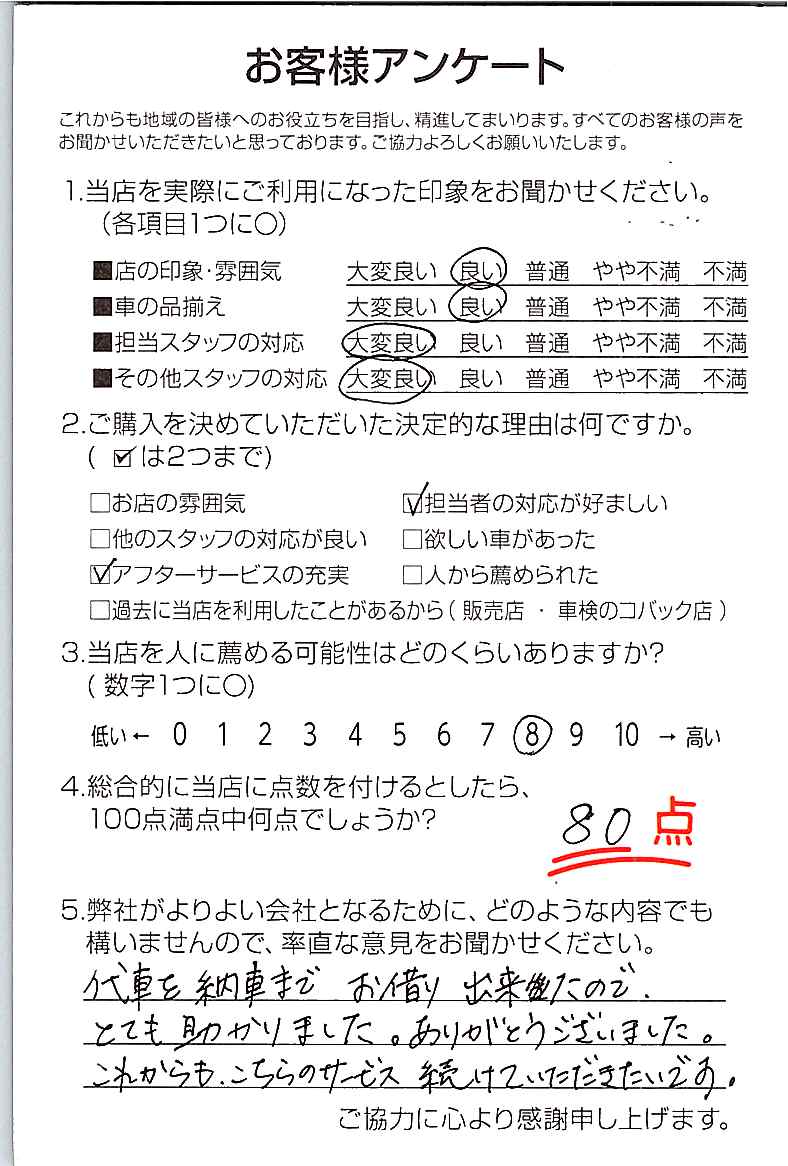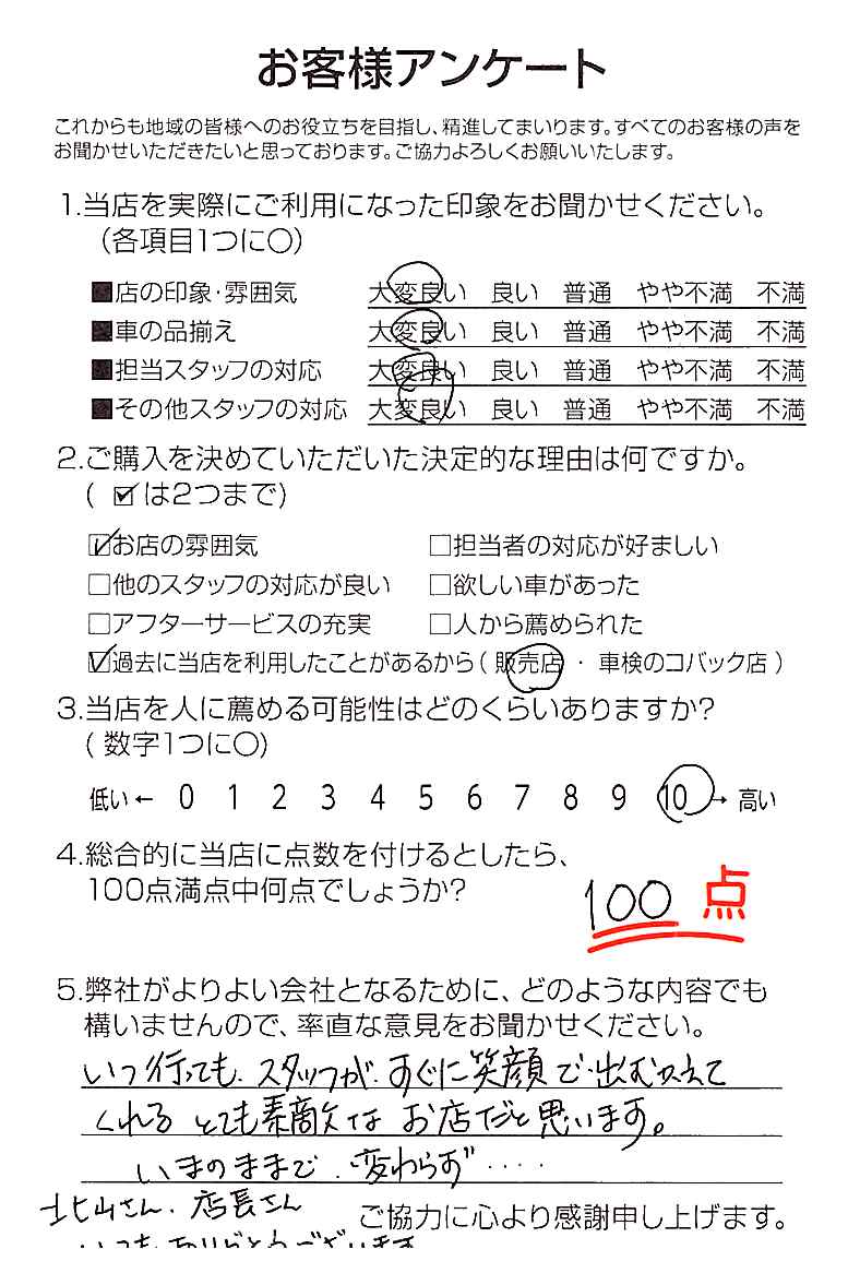 安心対応。当社は100%店頭販売で外回り・訪問営業は無く、お客様にとって真に価値のあるお役立ちを提供するために、販売だけではなく、自動車保険やローンの提案なども合わせた総合的な提案力を高めています。