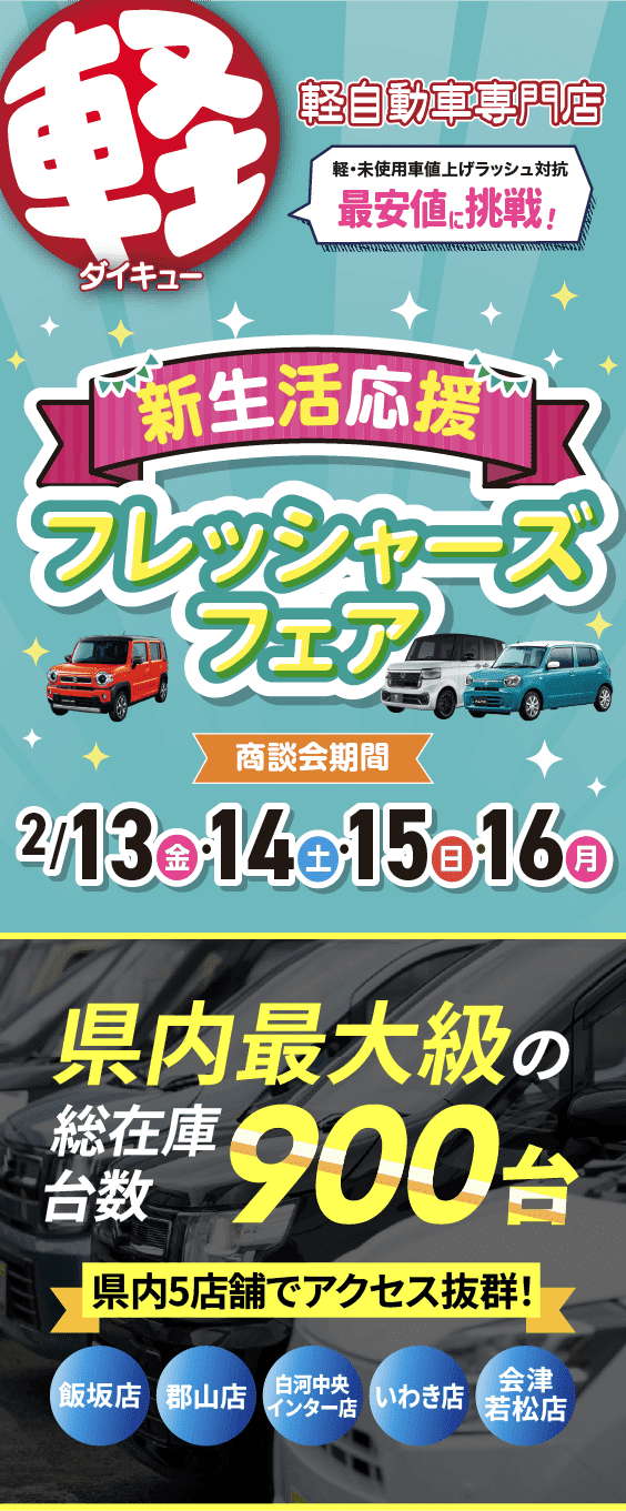 福島市、郡山市、いわき市、白河市、会津若松市でお客様にピッタリな1台をご提案いたします。